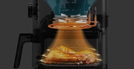 Циркуляция горячего воздуха происходит равномерно на 360 градусов. Широкая температурная зона от 40 до 200 градусов позволит готовить не только классические блюда во фритюре, но также использовать ее как йогуртницу, сушилку для фруктов, микроволновую печь и электрическую духовку.